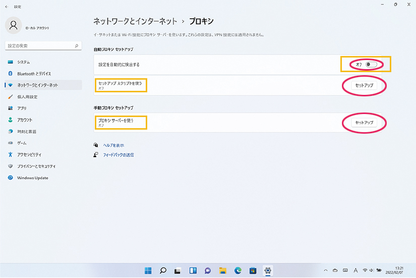 ・設定を自動的に検出する ... 「オフボタン」をクリックする。